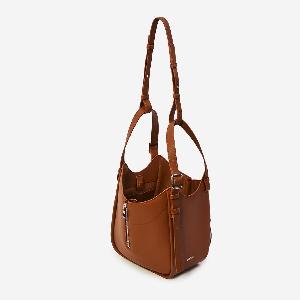 Squirrel brown calfskin bag. It features adjustable top handles with buckles, an adjustable and removable shoulder strap, two side zippers to adjust the silhouette, a side zippered pocket, the LOEWE signature on the front, magnetic closure, one main compartment, two internal flat pockets, and herringbone cotton canvas lining.